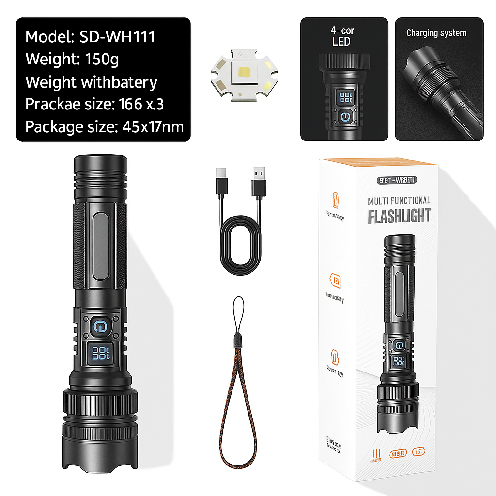 ⭕ZOOMABLE - Adjustable focus for use in different situations.The LED flashlight allows you to select focus between spot and flood beams.
